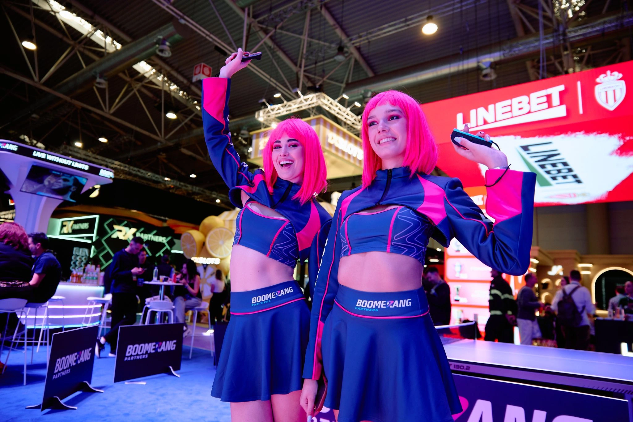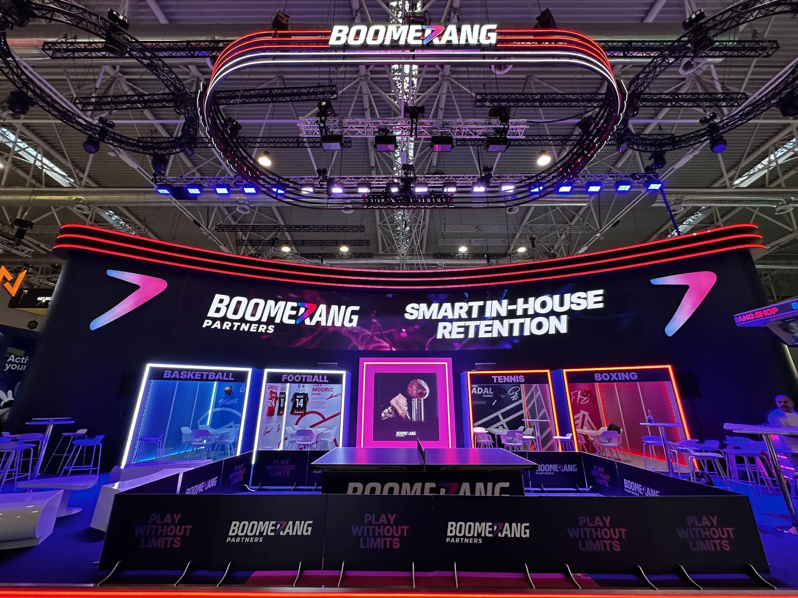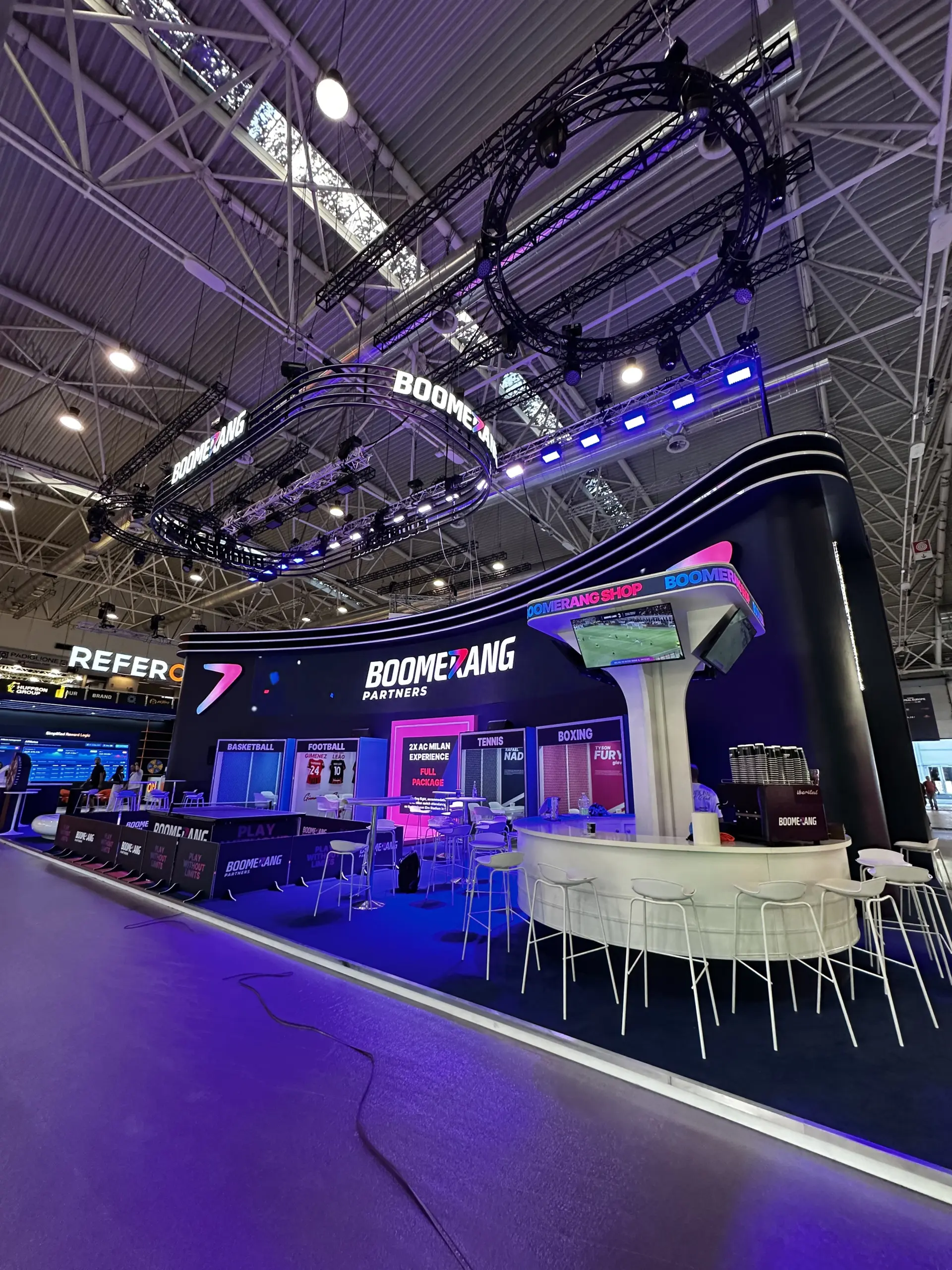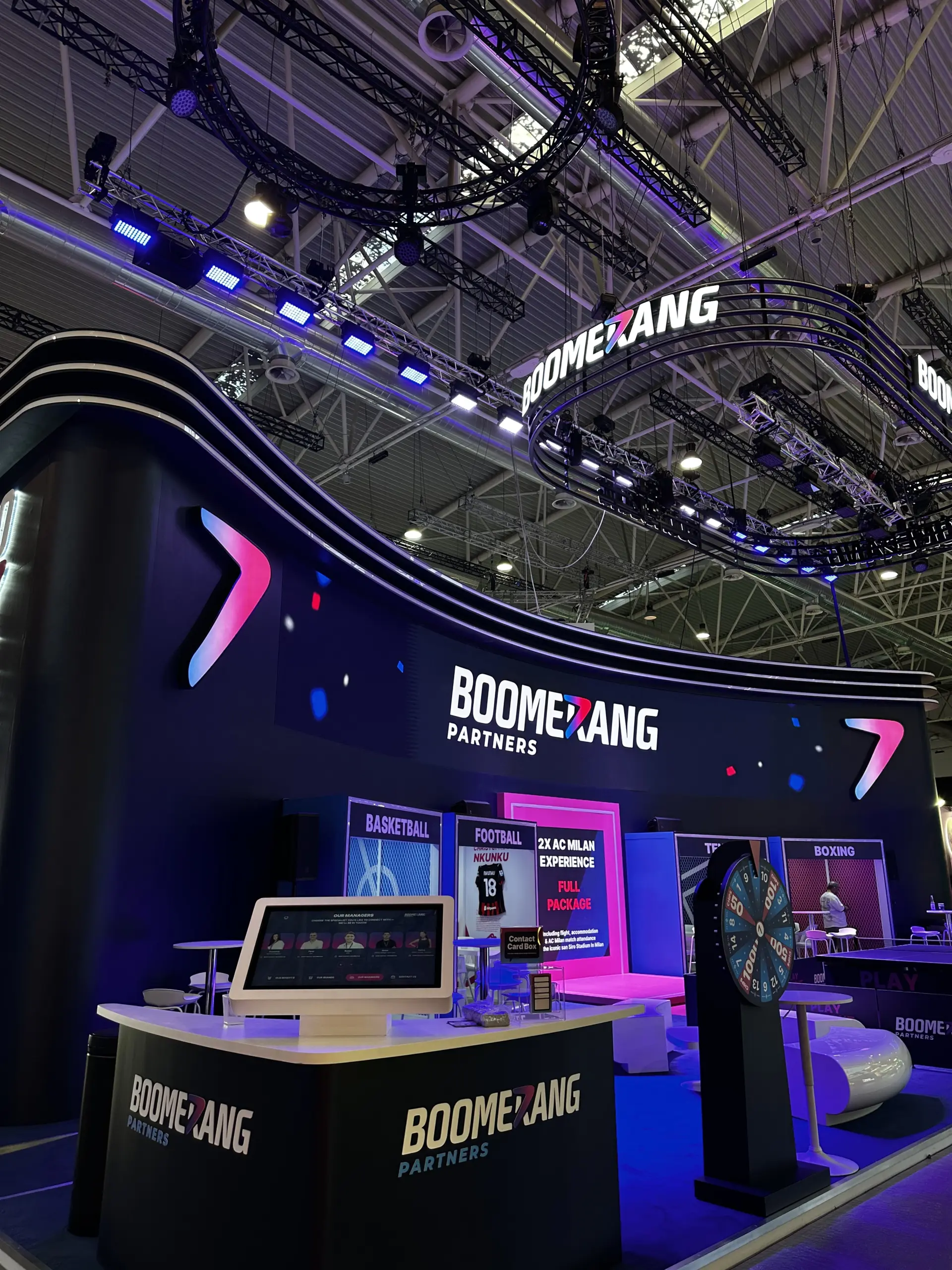 Additionally, dynamic concert lighting was implemented and synchronized with the booth activities. Lighting scenarios were adapted to prize draws, performances, and tennis tournament activities, enhancing visitor engagement and creating a live show effect. On the smaller screen, visitors could play sports video game simulators, further complementing the booth’s interactive experience.